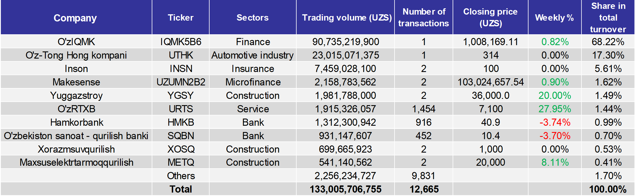 During the period, the Tashkent Stock Exchange recorded a total turnover of 133bln UZS across 12,665 transactions.