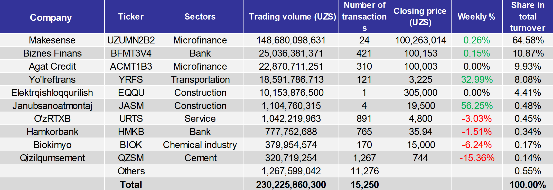 The Makesense bond (UZUMN2B2) led the market, contributing 64.6% of total turnover with a trading volume of 148.7bln UZS across 24 transactions. This bond was issued as 4,000 unsecured corporate bonds at 24% annual interest, totaling 400bln UZS. Biznes Finans (BFMT3V4), another newly issued bond, registered a trading volume of 25bln UZS across 421 transactions, representing 10.9% of total turnover. The Agat Credit bond (ACMT1B3) recorded 22.9bln UZS in trading volume from 310 transactions, accounting for 9.9% of turnover. This issue comprises 400,000 corporate bonds with a total nominal value of 40bln UZS.
