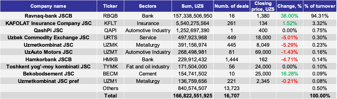 During the given period, the trading volume of RSE Toshkent reached an impressive amount of almost UZS 167 billion, which is 16.6 times higher than the trading volume of the previous period. The stock exchange observed active trading in a diverse range of 81 (-1) types of securities.