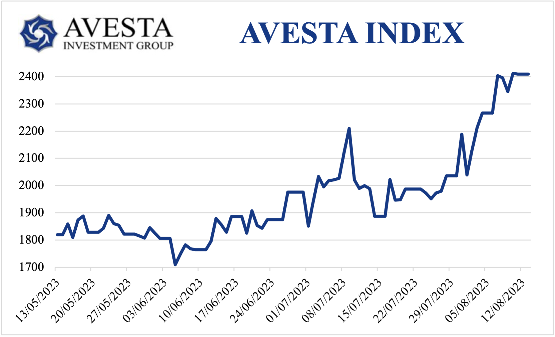 *AVEX is an index that describes the general market trend by covering the top 20 listed companies with the largest number and volume of transactions on the Tashkent Stock Exchange. The calculation of AVEX is based on the daily price of companies' stocks with their weighted average, which is determined by companies' liquidity and transaction turnovers. The base date is 01/01/2021 (1000).