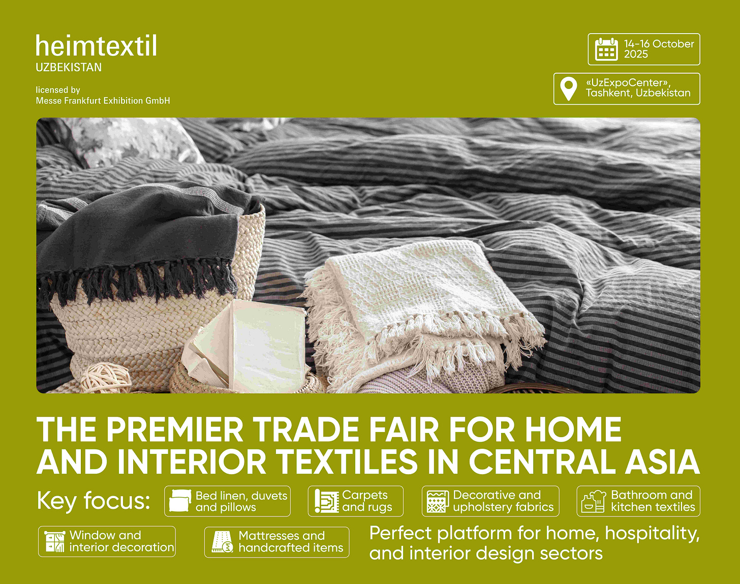 Heimtextil Uzbekistan. The largest interior and contract textiles exhibition in Central Asia. Key product groups include: home textiles (bed linen, towels, curtains, tablecloths); decorative and upholstery fabrics; carpets and floor coverings; textiles for hotels, restaurants, and HoReCa projects. Heimtextil Uzbekistan connects leading manufacturers and distributors with designers, architects, hoteliers, and wholesale buyers, serving as the main sourcing hub for interior and contract textile solutions.